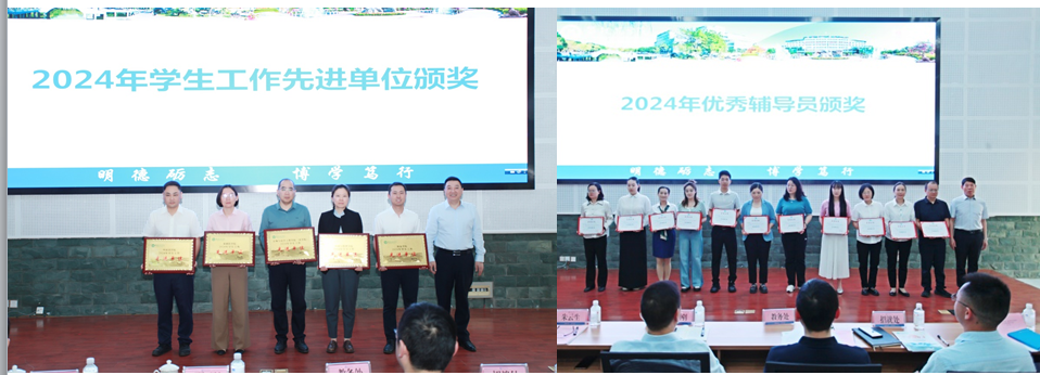 会议为2024年度学生工作先进单位钒钛学院、经管学院、生化学院(农学院)、医学院、外语学院和蔡旻甫等14名优秀辅导员颁奖。