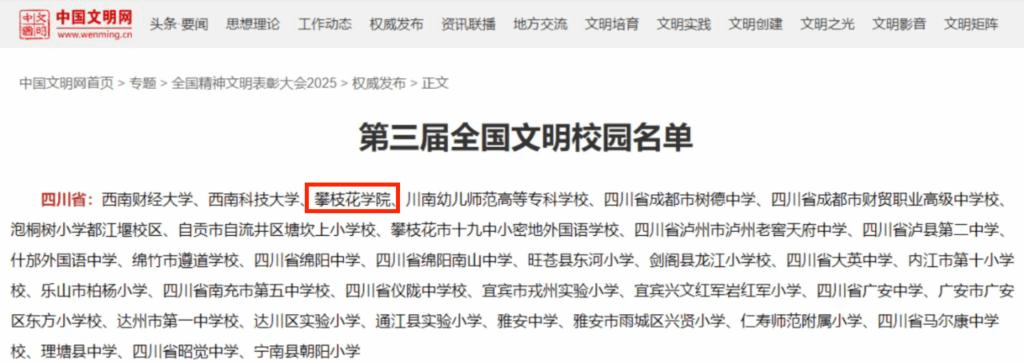 在创建过程中,学校聚焦立德树人根本任务,深入实施 “时代新人铸魂工程”,坚持三全育人,推进五育并举,构建十大育人工作体系,在人才培养、理论武装、课程思政、社会实践、志愿服务、社区建设等方面协同发力,创新开设“方毅·红班”“方毅·钛班”,全面提升人才培养质量。强化党建引领关键作用,以高质量党建引领高质量发展,全面构建基础一流、过程一流、增量一流考核体系,持续举办干部履职能力培训,积极培育党建工作品牌,推动学校治理体系和治理能力现代化。突出师德师风示范引领,以教育家精神为引领,树立“大德大爱大师” 教育精神追求,设立育人示范岗,激励全校教职工形成良好师德风尚。发挥文化育人盐融效应,结合学校办学特色和定位,融入攀西地域文化元素,一体推进康养文化研究、钒钛文化普及、廉政文化教育、三线文化传承四大区域特色文化融入人才培养,不断固化“木棉”“阳光”“静明” 三大校园文化活动品牌,倾力打造 “网络文化节”“科技文化节”“社团文化节”“美食文化节” 四大文化节庆,充分彰显文化育人功能。全方位推进校园绿化美化亮化工程,推进校园公园一体化建设,精心打造美丽生态、和谐文明、平安幸福校园。不断推动媒体融合,建立健全校园全媒体矩阵,全方位展示学校办学成果与育人成效。