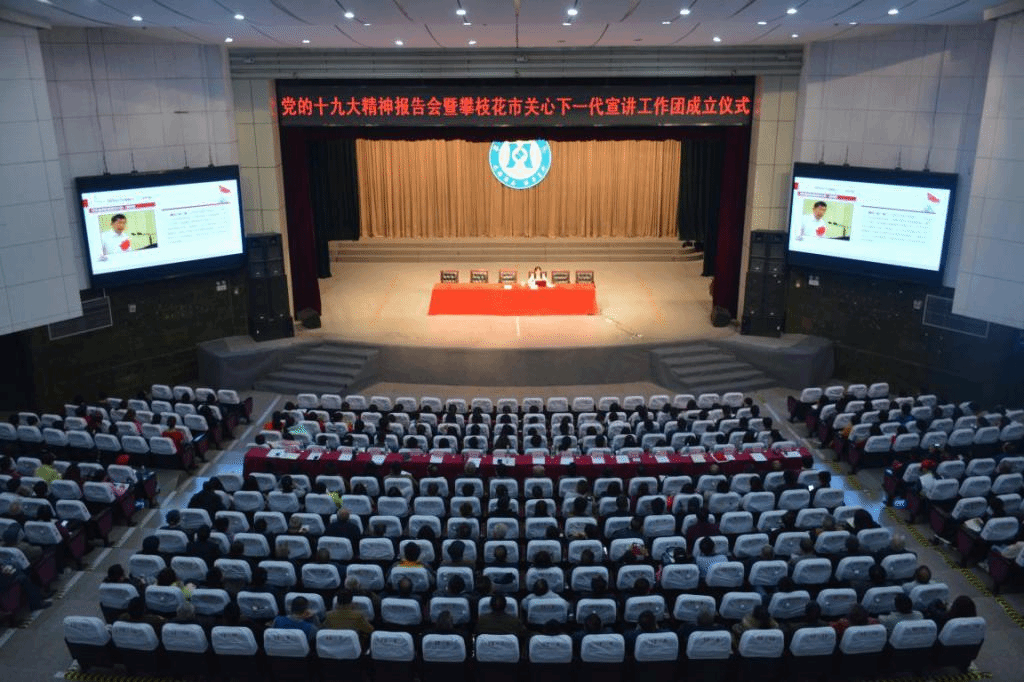 12月12日上午,党的十九大精神报告会暨攀枝花市关心下一代宣讲工作团成立仪式在beat365会堂举行。市关工委执行主任谢道全,常务副主任张彦博、张国民、杨长云,团市委书记任文,beat365关工委老同志代表及500余名学生参会。