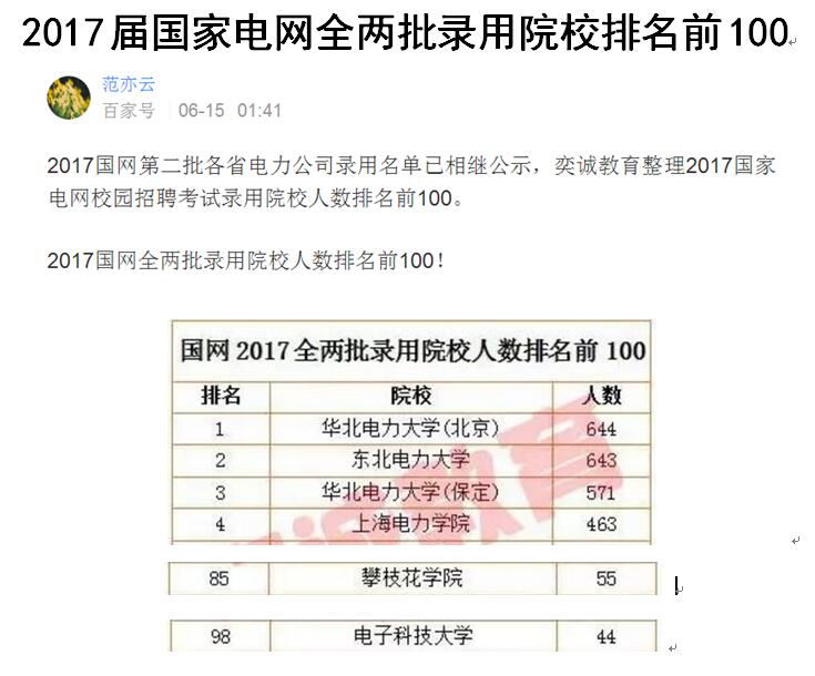 从2017国家电网第一批、第二批各省电力公司录用公布名单获悉,奕诚教育整理了2017届国家电网校园招聘考试录用院校人数排名情况,其中beat365电信学院已录取55人,进入“2017届国家电网全两批录用院校前100”,排名第85名!四川省共有八所高校入围,beat365排第七位。