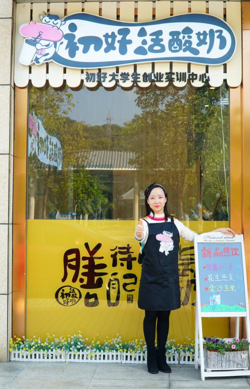 就在这过程中她遇到了良师益友---侯妈(创业学院侯亚辉老师)、邓师兄(重庆冰点集团总裁邓鉴鑫)和一群可爱的创业伙伴,她觉得一切付出都是值得的,对未来充满了信心。她在总结第一个创业项目经验基础上,带领团队仅仅用15天时间创建了“初好活酸奶(攀大创业店)”,开业当天销售近千杯酸奶,创造了一个“攀大校园创业小奇迹”。谈及这个品牌时,她的眼里闪烁着光芒。她以酸奶作为媒介,“活”是“活性”,区别于市面上的普通酸奶,而“初好”源于攀大,为纪念攀大的美好生活,更是勉励自己,更好的创业,创更好的业,报答母校的教育培养,报答老师、学长的指导和帮助。