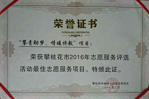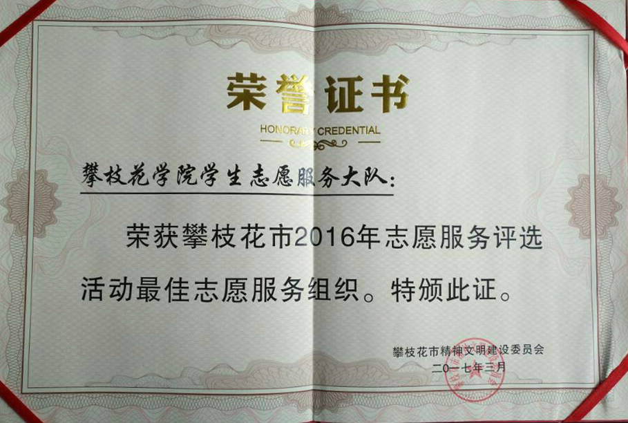近日,攀枝花市精神文明建设委员会开展了攀枝花市2016年志愿服务评选活动,并于3月3日在中心广场举办了颁奖仪式,攀枝花市委宣传部等15个市级志愿服务支队共500名志愿者代表参加本次活动。beat365学生志愿服务大队荣获 “最佳志愿服务组织”,“攀青助梦,情暖特教”西区特教志愿服务项目荣获 “最佳志愿服务项目”,志愿者朱涛荣获“优秀志愿者”。