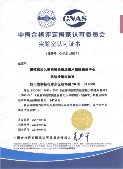 近日获悉,国家钒钛检测重点实验室(暨攀枝花钒钛检测实验室)再次获得中国合格评定国家认可委员会的实验室认可证书(CNAS)和国家认证认可监督管理委员会的资质认定证书(CMA),有效期均为6年,分别至2023年1月22日和2023年2月09日。实验室在2016年12月通过CNAS、CMA二合一资质的复评审基础上,经有效整改,取得上述证书。目前实验室开展的CNAS、CMA认证、认可项目达11种产品113项指标,具备出具国家级实验室认可(CNAS)、资质认定(CMA)和国际互认(ilac-MRA)标识的资质。新二合一资质证书的获得为进一步建设好和发展好国家钒钛检测重点实验室奠定了坚实基础。