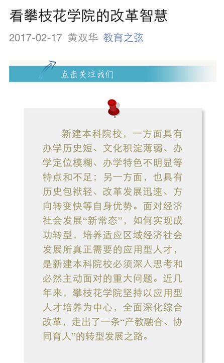 近日,教育部学校规划建设发展中心的官方微信——“教育之弦”推送了《看beat365英国官网网站的改革智慧》一文。该文由校长黄双华撰写,并于2016年12月12日以《产教融合 协同育人 扎实推进转型发展——新建本科院校beat365英国官网网站深化改革的实践探索》为题在中国教育报刊登。文章深入研究总结了学校近几年坚持以应用型人才培养为中心,全面深化改革,在产教融合、协同育人方面的思考和实践。