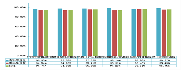 毕业生对学校就业指导服务的满意度:学校2020届毕业生对学校各项就业指导服务的满意度均在94.26%以上;其中满意度最高的三方面是“生涯规划/就业指导课”、“就业手续办理(户口档案迁移等)”和“职业咨询与辅导”。一方面表明学校就业指导服务工作得到了毕业生的认可;另一方面也体现了学校就业工作在促进毕业生顺利就业、高质量就业中所发挥的重要作用。