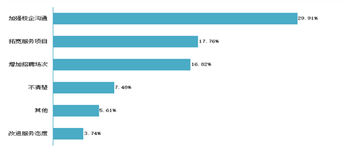 用人单位普遍认为学校应在“加强校企沟通”(29.91%)、“拓宽服务项目”(17.76%)和“增加招聘场次”(16.82%)这三个方面来加强就业工作。