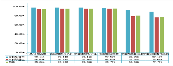 注:毕业生对创业指导服务的评价包括满意度评价(创业课程和讲座、创业模拟与实训、创新创业大赛、创业指导服务)和帮助度评价(创业场地支持、创业资金筹措支持)。满意度为选择“很满意”、“比较满意”和“一般”的人数占“此题总人数—无法评价”的比例。帮助度为选择“很大帮助”、“较大帮助”和“有些帮助”的人数占“此题总人数—无法评价人数”的比例。